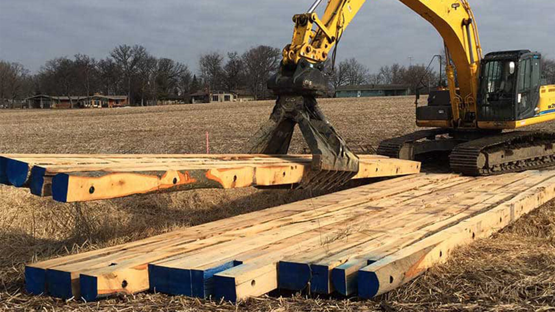 Sterling’s crane mats are purpose-built for heavy-duty applications, offering key advantages over standard timber mats. Unlike timber mats, which vary in size and thickness, crane mats are typically 12×12 inches, providing a uniform and robust platform that enhances stability and load distribution for heavy equipment. Constructed from dense hardwood or solid Douglas Fir timbers, crane mats are engineered to handle extreme pressures while maintaining durability. Their design features include narrow notches for precise placement, exposed lifting bolts on each end for easy transport, countersunk nuts to reduce wear and tear, and flush-cut long bolts for a smooth, snag-free surface. These elements ensure that Sterling’s crane mats deliver the strength, reliability, and functionality required to support cranes and other large machinery in challenging environments.