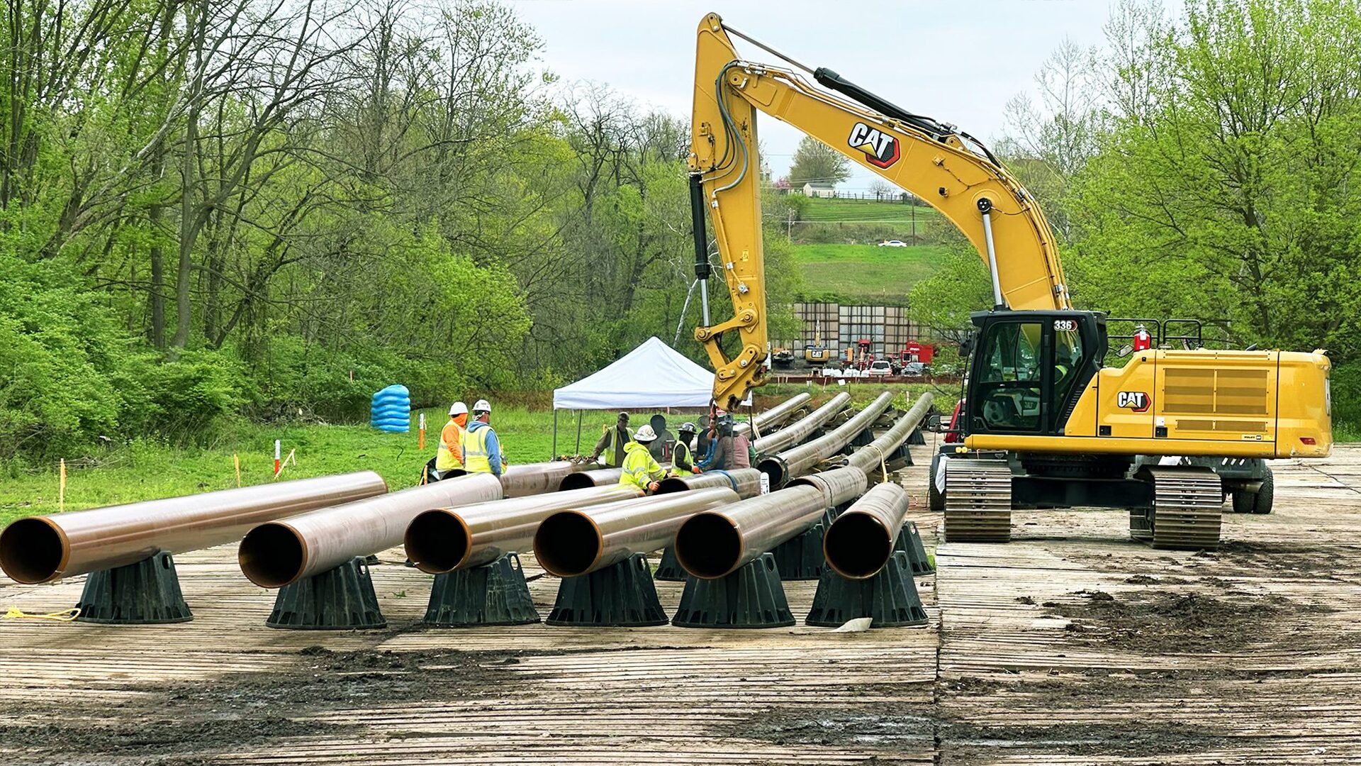 HDD is a highly efficient method used to install pipelines underneath obstacles like rivers, roads, and urban infrastructure without the need for disruptive, large-scale trenching. This type of work often requires large equipment and supplies in areas not designed to handle such weight so matting is used to protect the ground, create a stable surface for equipment to operate on, and to store pipeline sections. Traditionally, timber mats have been used for this but TerraLam mats bring an engineered product with known load ratings in a package that delivers more lineal footage per mat, freight savings of up to 50%, and a higher quality work surface to enhance jobsite safety.